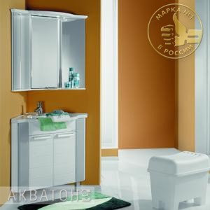 Угловая модель для небольших ванных комнат. Тумба на регулируемых по высоте ножках комплектуется удобной раковиной из литого мрамора. А угловой зеркальный шкаф со светильниками на верхней панели и полочками, расположенными как внутри, так и снаружи шкафа поможет значительно сэкономить пространство.