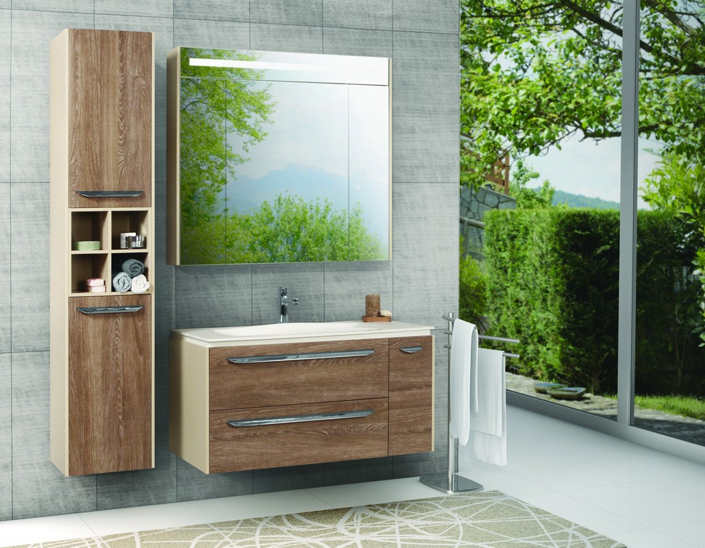 При отделке изделий коллекции используются влагостойкие материалы. Детали белого цвета имеют идеальное 5-тислойное глянцевое покрытие. Покрытие боковых стенок цветной тумбы - матовая отделка. Фасады цвета <<дуб европейский>> покрыты высококачественной пленкой (производитель - Германия).