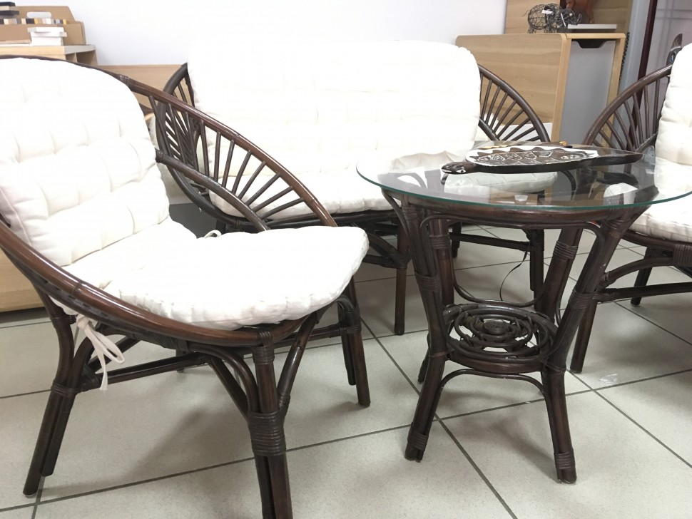 "Материал: каркас - натуральный ротанг (высший сорт), мягкие элементы - хлопок, столешница - закалённое стекло. Размеры: кресло - 70х65х78см, диван - 0х65х78см, стол - D50х56,5см