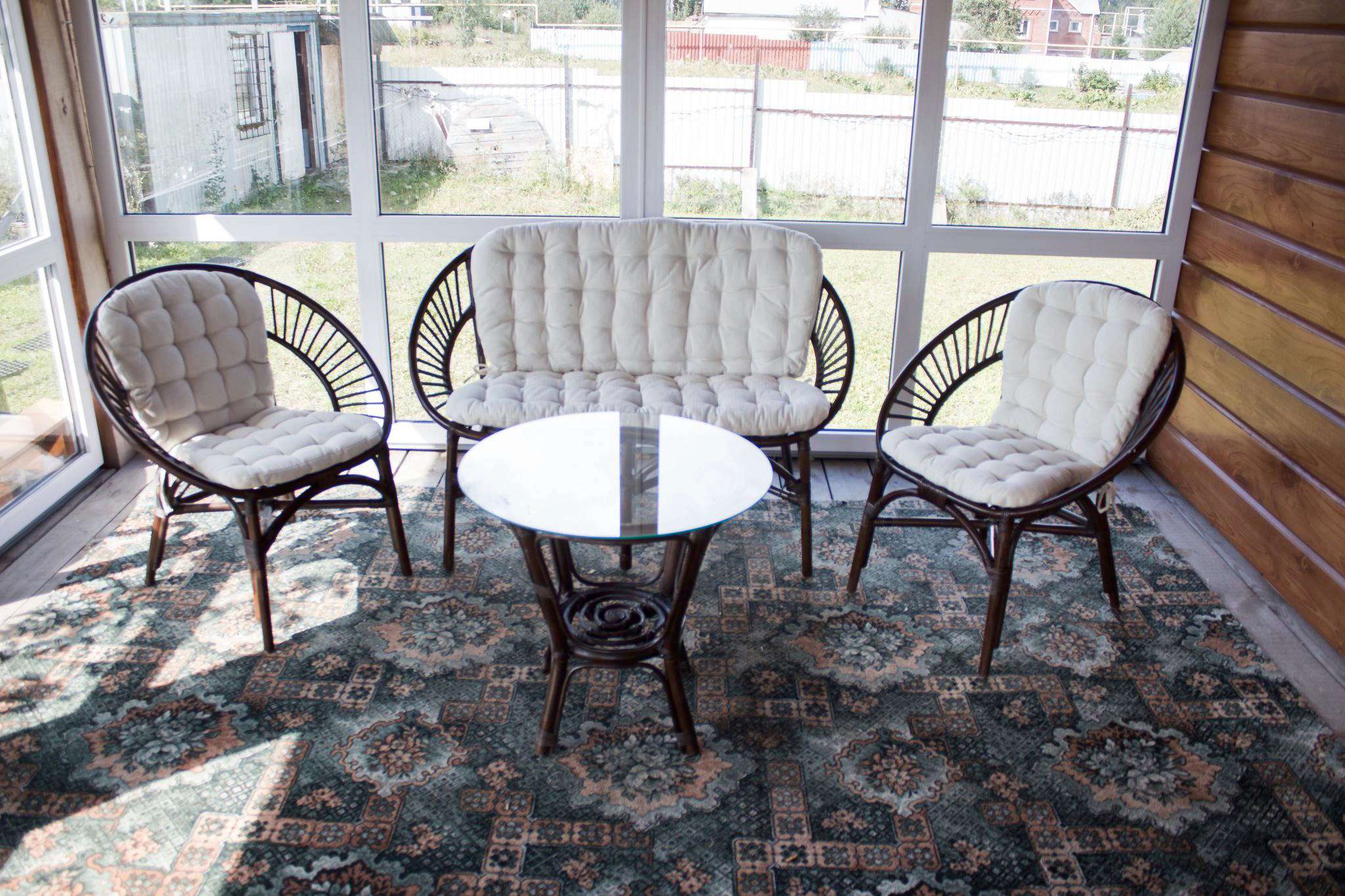 "Материал: каркас - натуральный ротанг (высший сорт), мягкие элементы - хлопок, столешница - закалённое стекло. Размеры: кресло - 70х65х78см, диван - 0х65х78см, стол - D50х56,5см