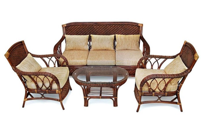 "Материал: каркас - ротанг (высший сорт), мягкие элементы - ткань (хлопок+полиэстр) + наполнитель (холлофайбер), столешница - закалённое стекло. Размеры: диван - 172х80х95 см, кресло - 75х80х95 см, столик - 85х52х47 см